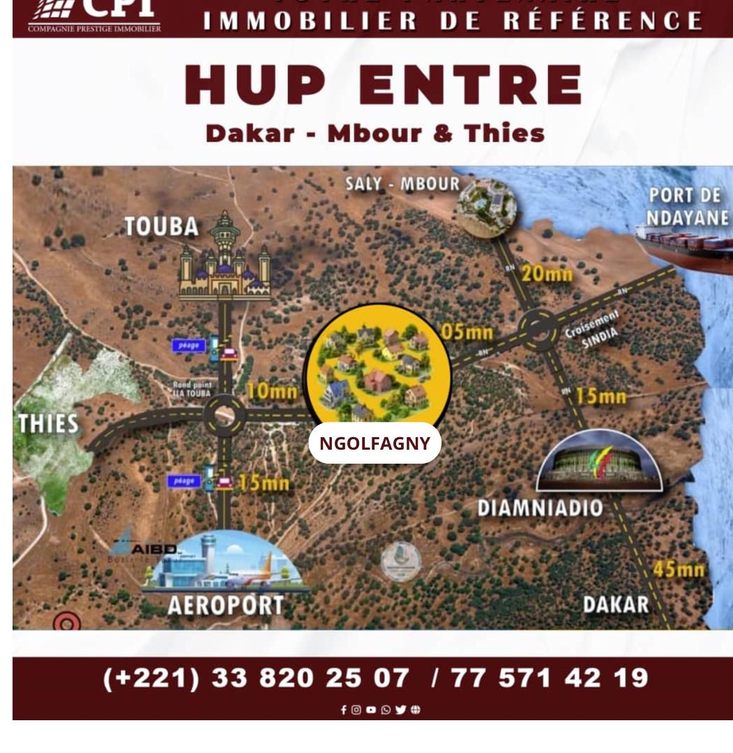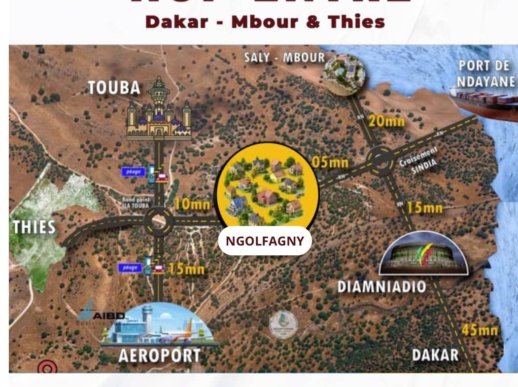 NGOLFAGNY localité située dans la Région de Thiès, dans la commune de NOTTO DIOBASS. Une Carrefour stratégique entre Dakar, Diamniadio, Mbour et Thiès, devenu un HUP très accessible, proche de Dakar, la résidence idéale de Demain qui va abriter plus de 1200 parcelles étendues sur plus de 50 hectares, NGOLFAGNY devient une petite ville verte avec un climat doux bénéficiant de sa proximité avec la mer non loin de Guérow, Popenguine, ndayanne…